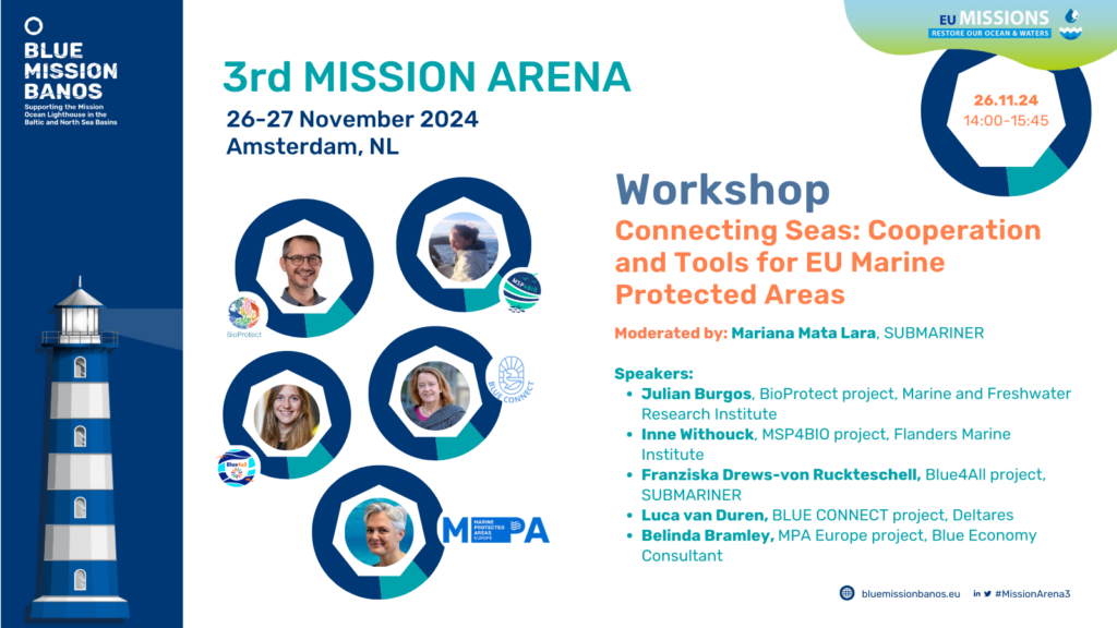 On November 26th, 2024, during the 3rd Mission Arena in Amsterdam, the panel session “Connecting Seas: Cooperation and Tools for EU Marine Protected Areas (MPAs)” brought together leading voices from EU-funded projects to address critical challenges and opportunities in marine conservation. This session united representatives from BioProtect, BLUE4ALL, MSP4BIO, Blue Connect, and MPA Europe. Each project showcased the tools and methodologies they are designing to safeguard marine biodiversity while fostering sustainable governance and stakeholder collaboration in Marine Protected Areas across Europe.
