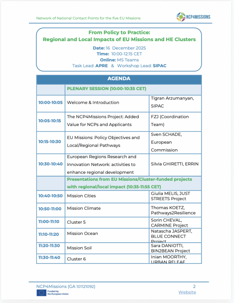 This workshop is perfect for potential applicants, NCPs, and stakeholders from regional and local authorities, research, and civil society who want to see how EU Missions and Clusters create real impact on the ground.